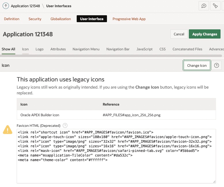 - New edit region in Shared components, where you can check the existing icon and modify it. Could be found under Shared Components – User Interface Attributes – Icon. This new Icon section replaces the now deprecated Favicon HTML section. If you had however your own custom icons added there, they will be migrated with the option to select a new icon using the new interface (check screenshots below).